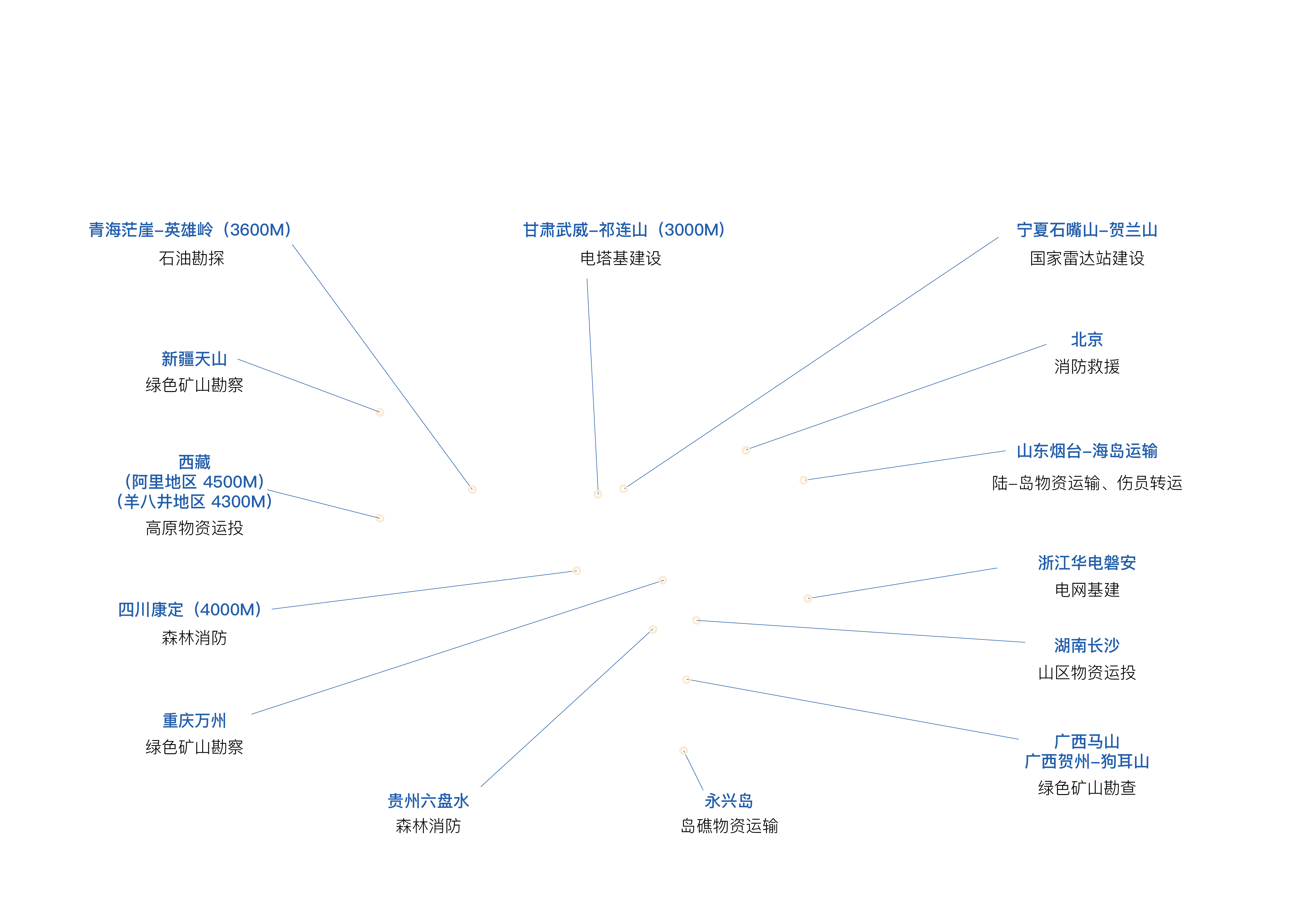 - 驼峰”系列无人直升机定位于重载运输、应急救援等领域,在性能、载重、续航及环境适应能力等方面均处于行业领先水平。该系列产品已广泛应用于中石油、中石化、中建材、国家电网、中国消防救援总队和应急管理等部门,服务于民用运输、应急消防、国土勘测、海洋与高原运输、岛礁物流配送及科研挂飞等多元化应用场景。凭借丰富的实战经验和卓越表现,“驼峰”系列成为低空特种物流领域最具应用价值的机型之一。